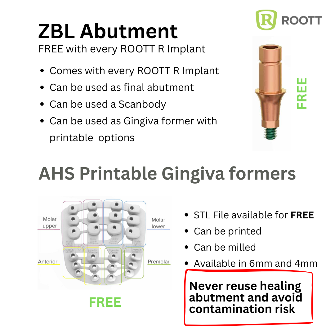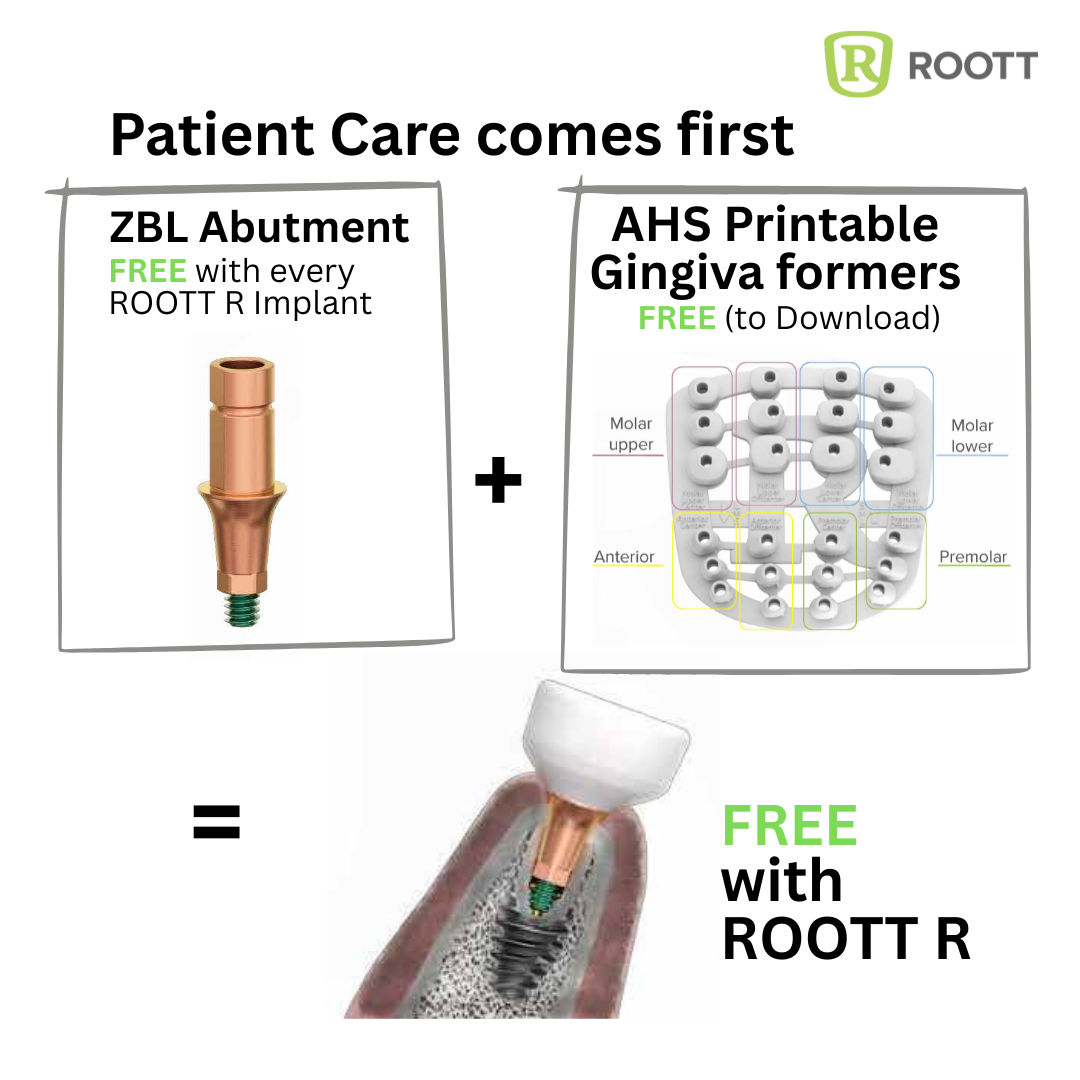 ROOTT Dental Implants SAVE CHAIR TIME with a streamlined design, surgical approach and prosthetic solutions. Cross-compatible allows practitioners to select optimal implants based on bone conditions. Tissue-level and single-piece designs eliminate extra surgical stages, enabling faster prosthetic placement and fewer appointments. Discover the ZBL free abutment include with every ROOTT R Viper (2 Piece Implant) alongside the AHS printable gingiva formers assist Practitioners to SAVE on Lab Costs. SAVE CHAIR TIME today.